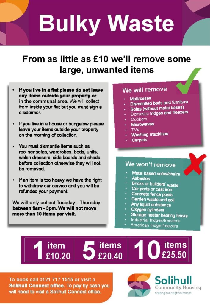 Estate Assistant’s will not be going into tenants properties, if you live in high rise or low rise you must put the items out on the morning of the collection after receiving a phone call half an hour before the collection time. This is to prevent creating fire hazards in communal areas overnight.