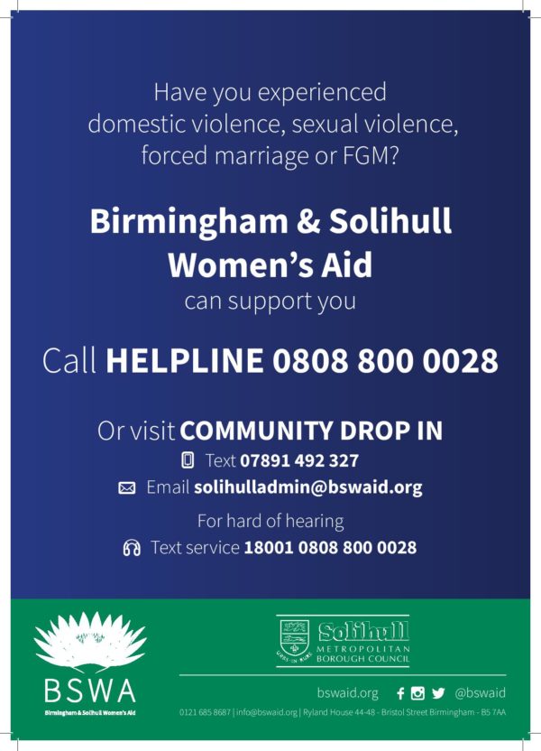 - Phone: 0121 788 4333 or out of hours 0121 605 6060
